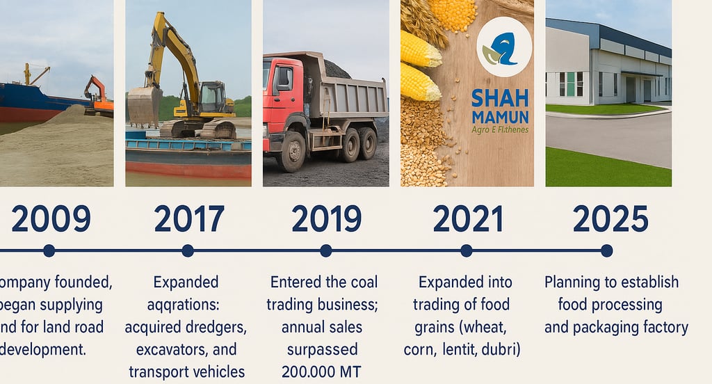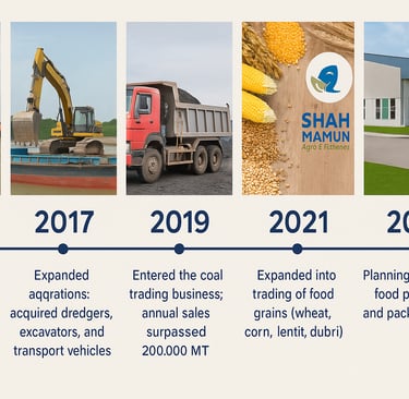 After completing his studies, he returned to Bangladesh with a vision: to build a company that supports national infrastructure, industry, and food security. He established Shah Mamun Enterprise and has been successfully leading its growth — from sand supply and dredging operations to coal trading, agri-commodities, and integrated agro & fisheries ventures.